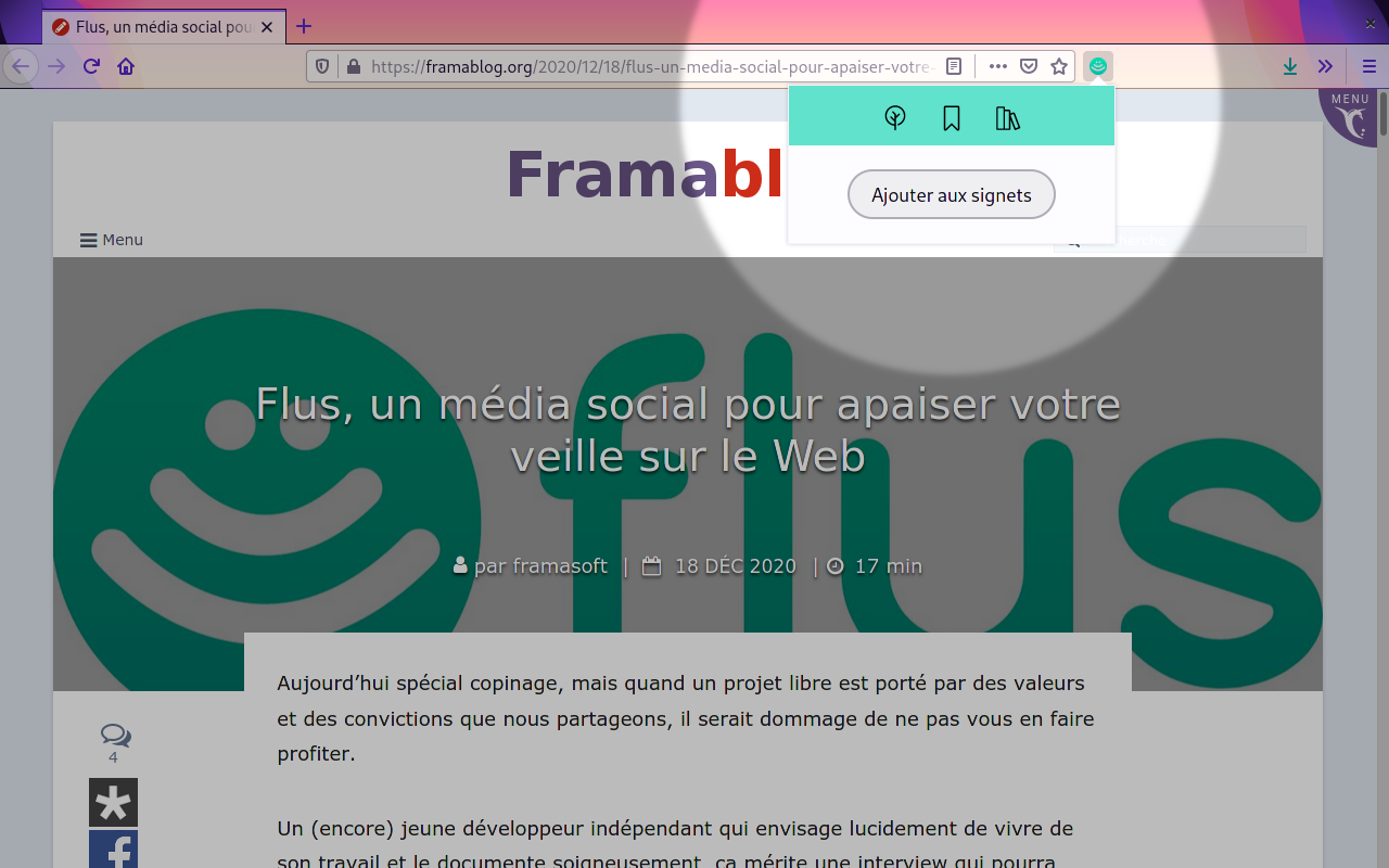 Une fois installée, l’icône de Flus apparait en haut de votre navigateur. Lorsque vous vous trouvez sur un article que vous voulez mettre de côté, cliquez sur l’icône, puis sur « Ajouter aux signets ». S’il s’y trouve déjà, l’extension vous le signalera.